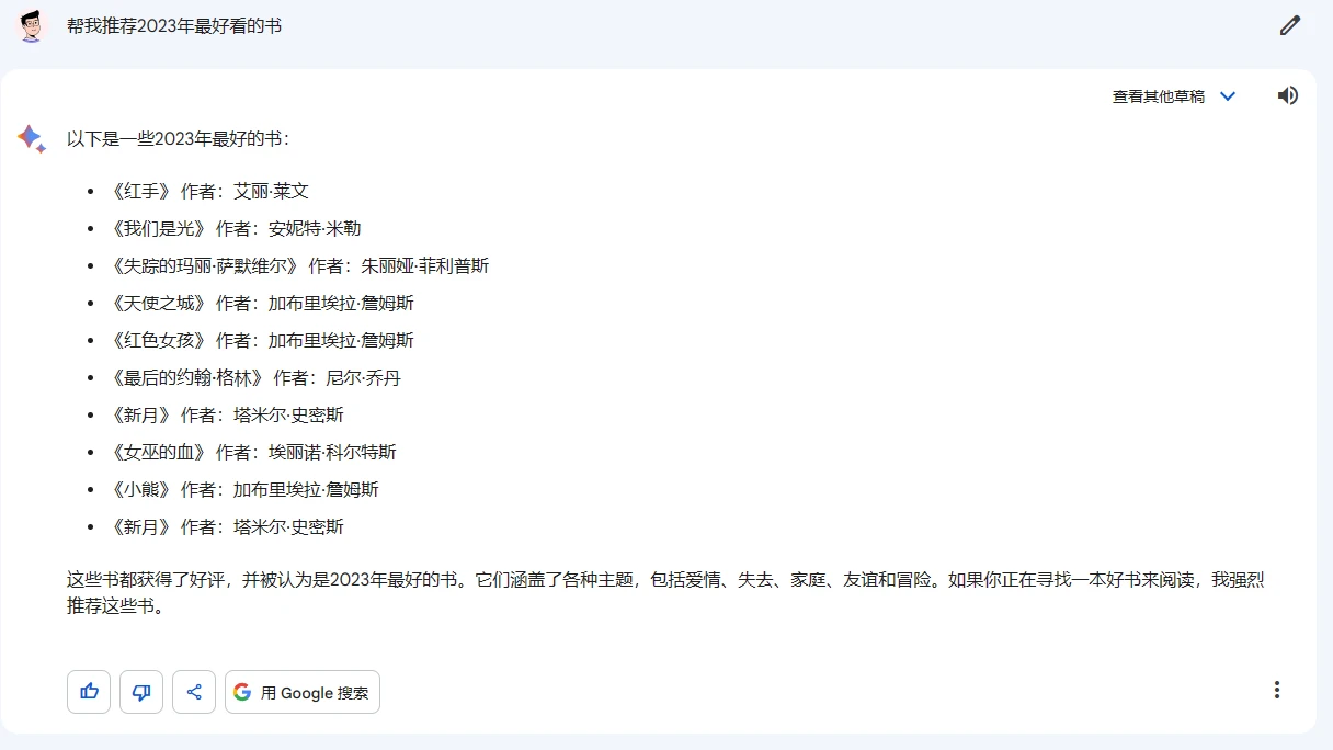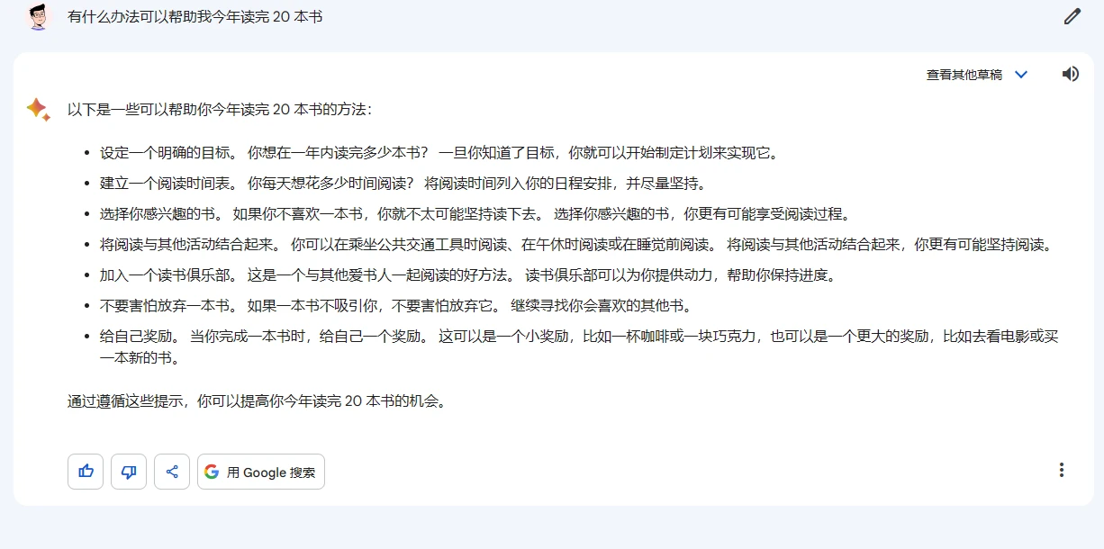 - 原因:当 Bard 的回答基本符合需求,但需要微调时,你可以更轻松地把回答调整成更为符合需求的行文风格。