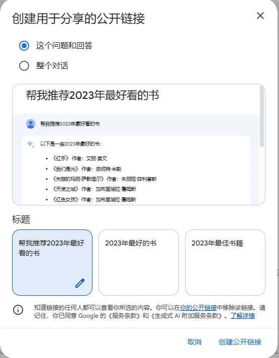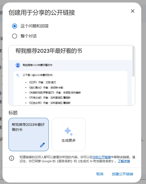 - 具体变化:你可以更轻松地与其他人分享部分或完整的 Bard 对话内容。利用可分享的链接,让其他人只需轻轻一点,即可轻松流畅地查看你的 Bard 对话内容和相关信息来源。