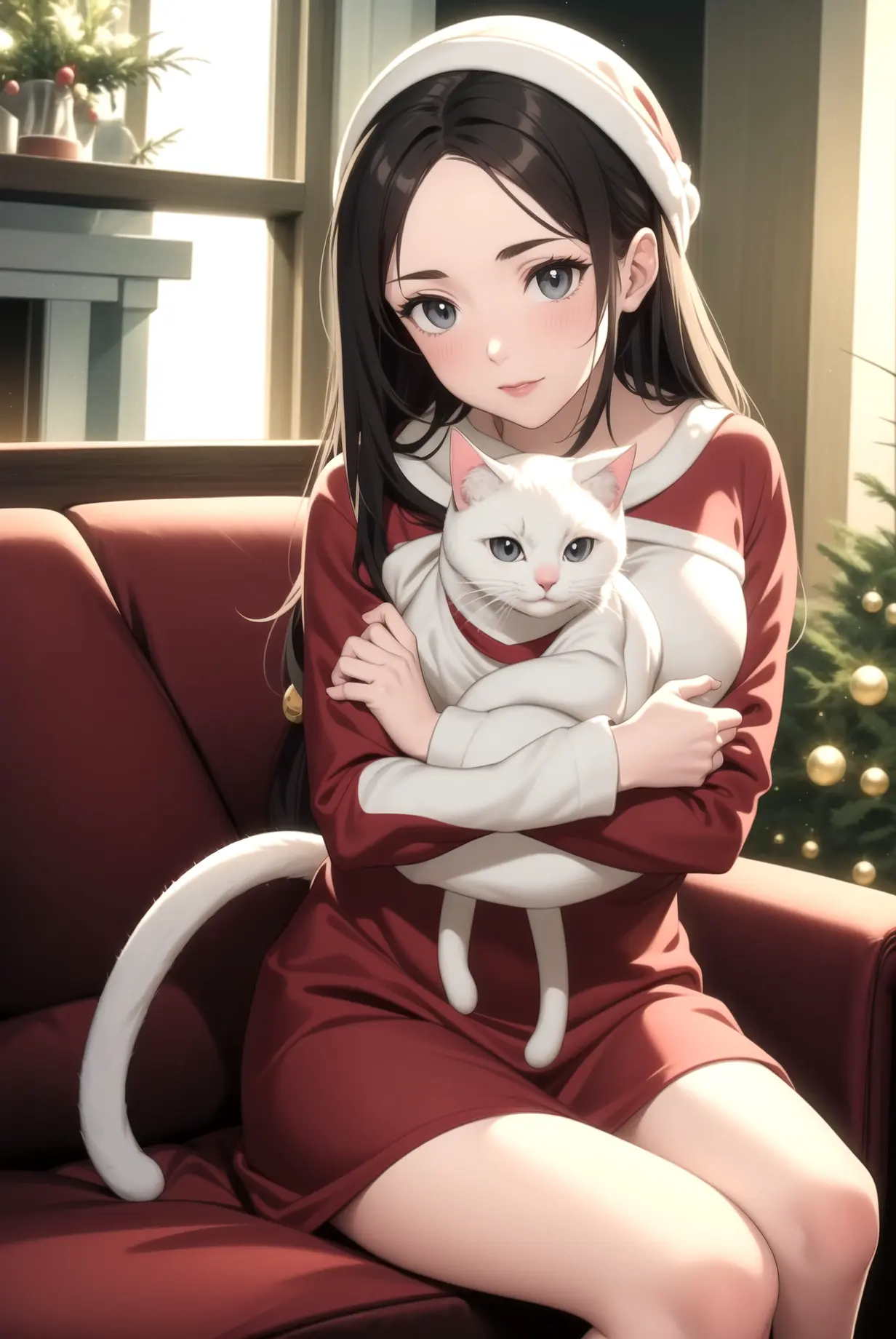 (best quality, masterpiece:1.15), 1girl, hugging cat, sitting on sofa, cosy, christmas, lora:christmas_slider_v1:2