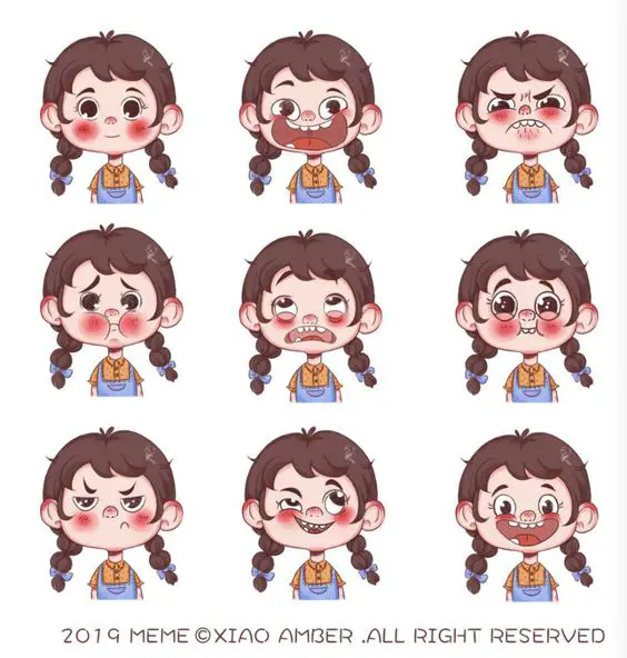 2️⃣ a set of smiling faces of a girl, in the style of meme art, exaggerated poses --ar 35:37