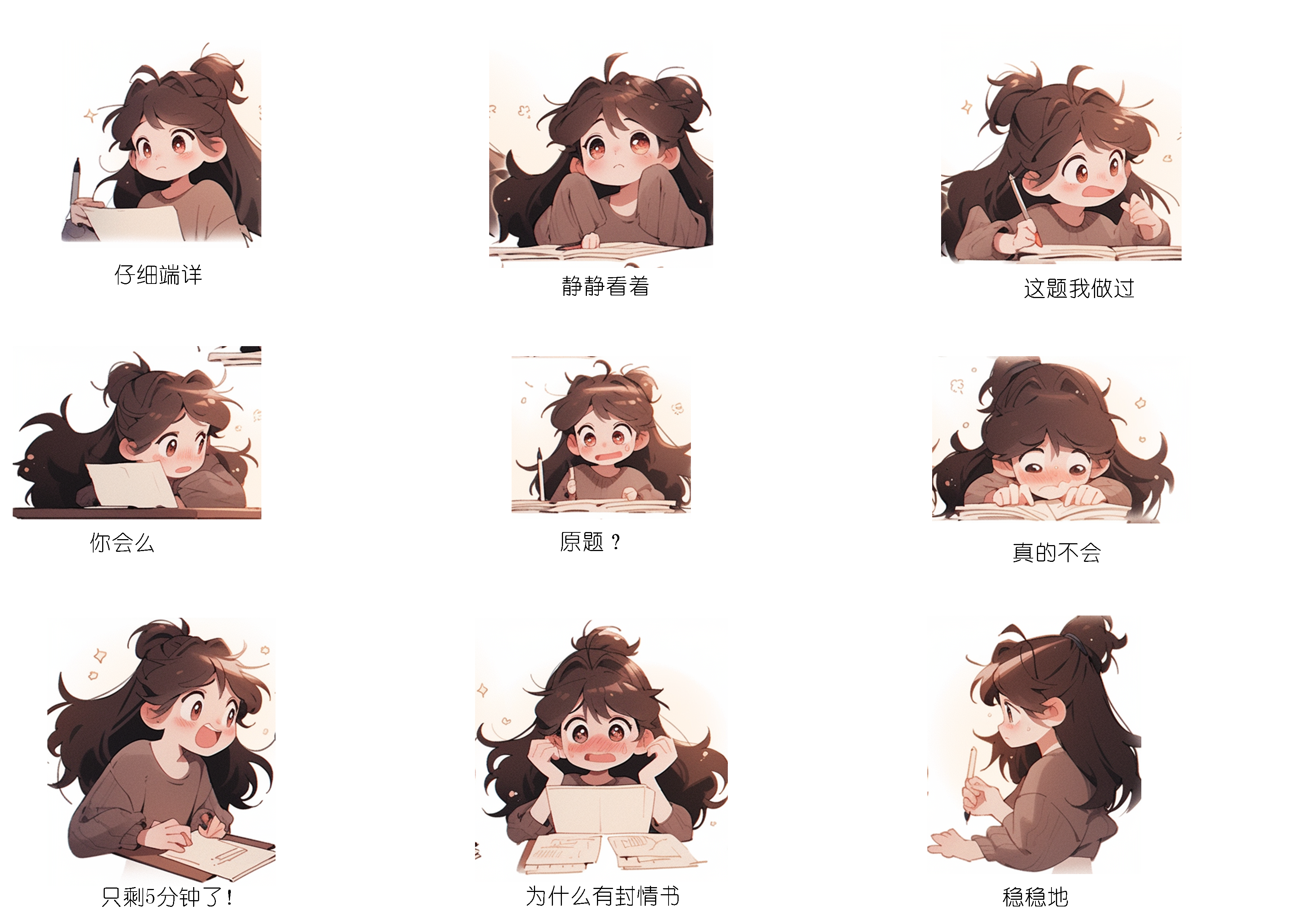 A girl writing notes, the girl with many kinds of expressions that show expression marks, light white and dark brown,popmart design, anime-inspired character designs, expressive comic panels,,strength of 3D,Extremely meticulous,C4D --ar 1:1 --iw 2 --niji 5