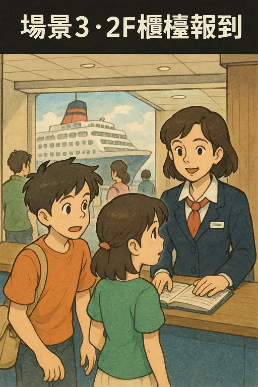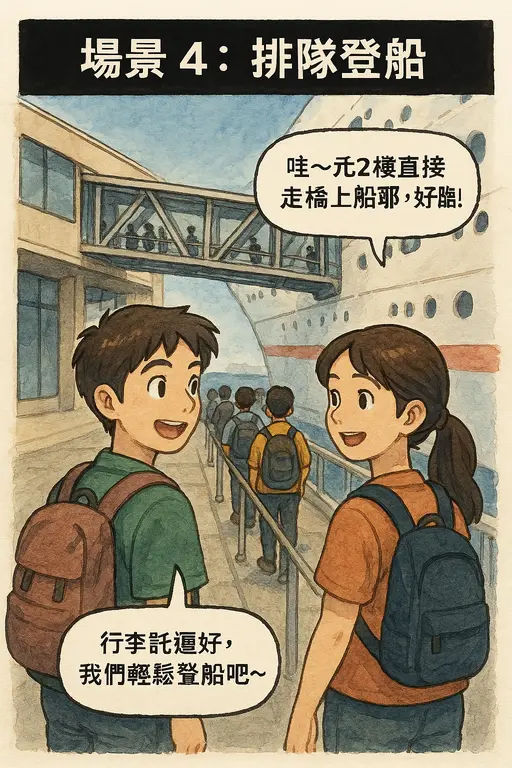 幫我創造一個連環漫畫,以簡單台詞、場景說明整個郵輪登輪作業流程
