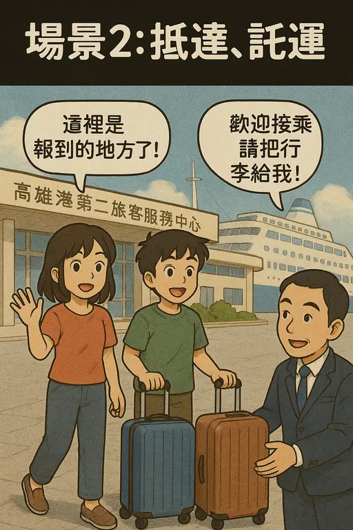 - 對白:櫃檯服務員:「Passport, 護照、船票、信用卡」