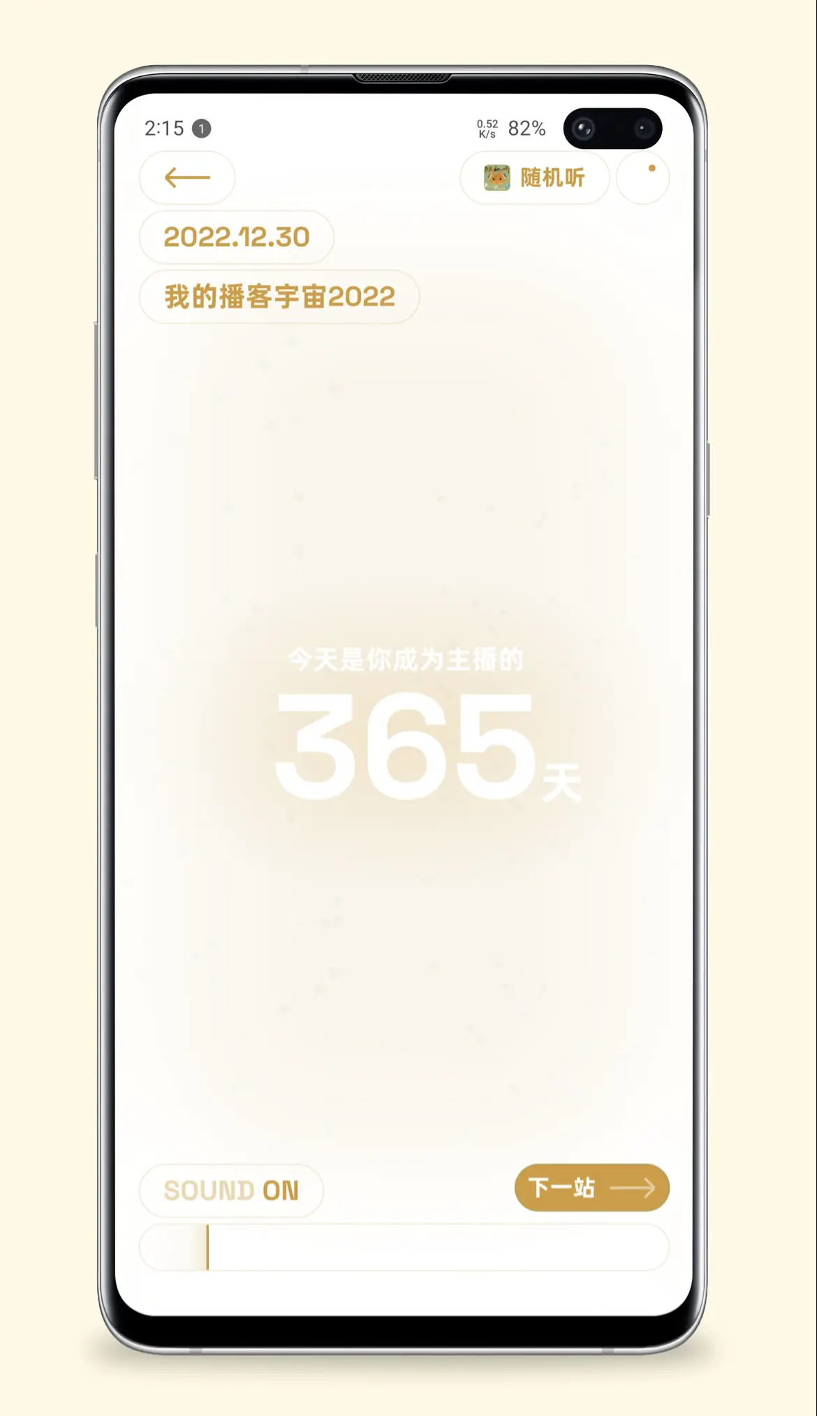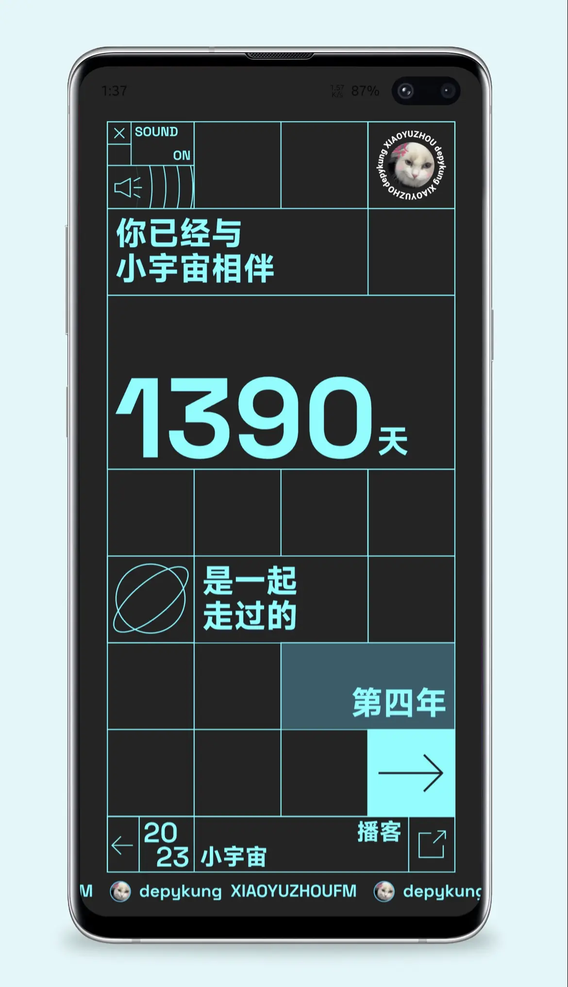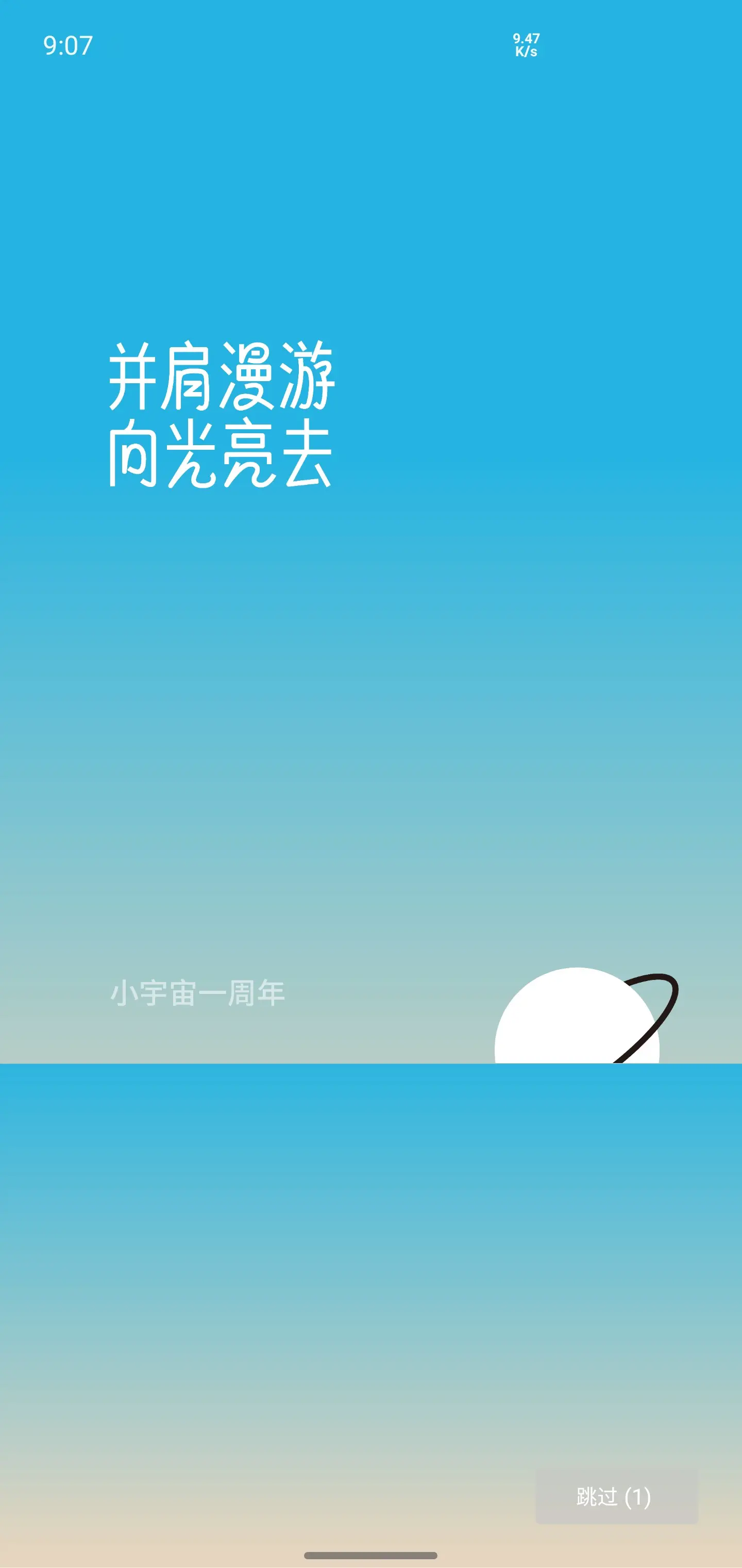 Anyway,沿着这个顺序继续翻看,这是小宇宙一周年(2021 年 3 月 26 日)当天的开屏。那时,开屏对这个简洁产品来说可还算得上稀罕事,猜得到右下角的跳过按钮点击率很低。尤其喜欢字体,这种有设计感的开屏哪怕放在今天都很少见。