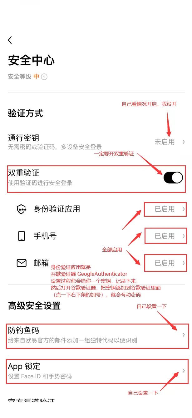 在主页点击右上角的九个点,进入账户和功能按钮界面;点击上方账户,进入账户设置;首先做身份验证,准备好身份证,按他的提示操作;一二级身份验证做好以后,开始安全设置,通行密钥自己看情况开启(我没开),双重验证一定要开启,下面三个全部开启,身份验证器就是谷歌验证器GeogleAuthenticator,设置过程他会给你—个密钥,记下来,然后打开谷歌验证器,把密钥添加到谷歌验证器里面(点一下右下角的加号),就会有动态码。防钓鱼码和app锁定按他的说明设置一下。