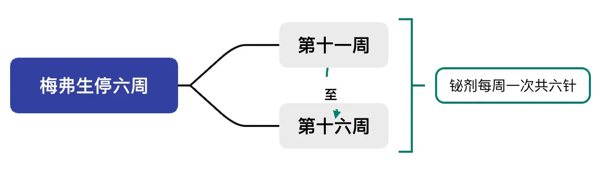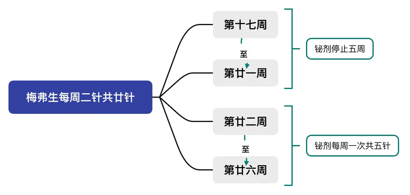 一九四二年七月美国军医署公布关于梅毒治疗之二点:(一)专用梅弗生 Mapharsen (一种新砒化合物)代替其他砒剂(六〇六,九一四)。(二)缩短治疗期限,早先为每周注射一次,一料砒剂与一料铋剂互相对调,须一年至二年之期限。现则紧缩为四十针梅弗生,每周注射二次,另加铋注射剂,总共期限为二十六星期,梅弗生每针剂量为 0.06 克,次柳酸铋为 0.2 克,治疗程序如下表: