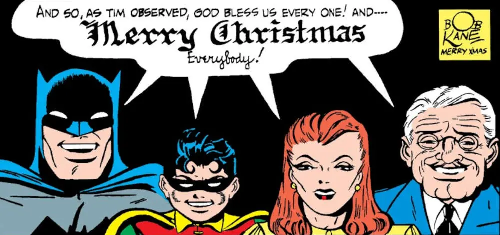Non mi resta, quindi, che augurarvi (anche se con un po' di anticipo) un "Buon Natale", ma lo lascio fare alla vignetta di chiusura di Batman #9 del 1942 dalla "viva voce" di Batman, Robin, Linda Page e del commissario Gordon!