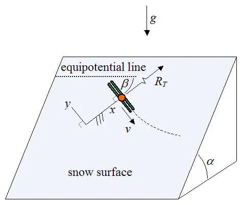 Iniziamo a descrivere lo slalomista che sta scendendo lungo il fianco della montagna, ovvero lungo un piano inclinato, partendo dal moto degli sci. Osserviamo prima di tutto che la linea degli sci non è perpendicolare alla linea equipotenziale, ovvero alla linea che collega due punti con la stessa energia potenziale, ma presenta una data inclinazione.