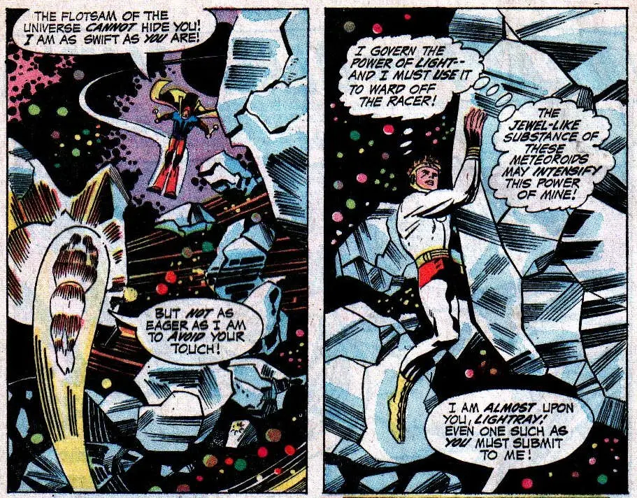 Nella scena iniziale dell'albo troviamo Black Racer che, come scritto all'inizio, si muove in slalom tra gli asteroidi mentre insegue Lightray (noto in Italia anche come Raggio di luce), con la velocità di un discesista (d'altra parte Lightray è in grado di raggiungere anche la velocità della luce) e la precisione di uno slalomista.