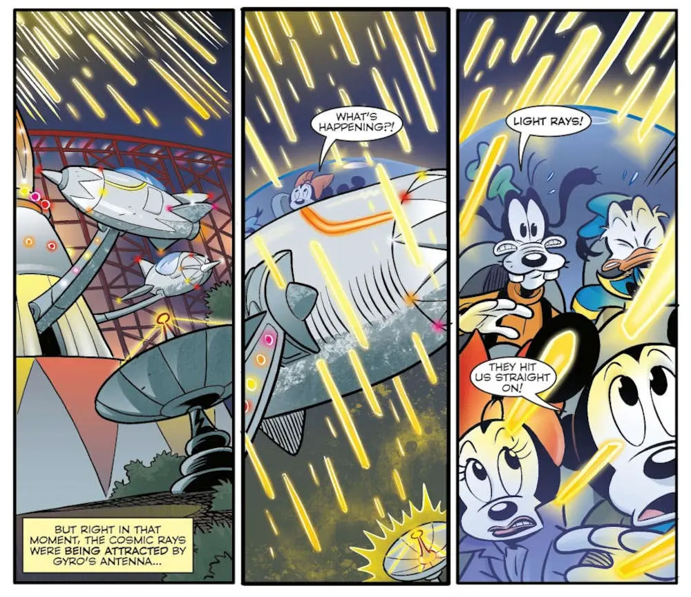La cosa che, ovviamente, stride di più è il fatto che a causa dell'interazione con l'atmosfera, le particelle della radiazione cosmica riducono di molto la loro energia, per cui è ancora più improbabile che Topolino & friends subiscano un effetto di trasformazione simile a quello dei Fantastici Quattro.