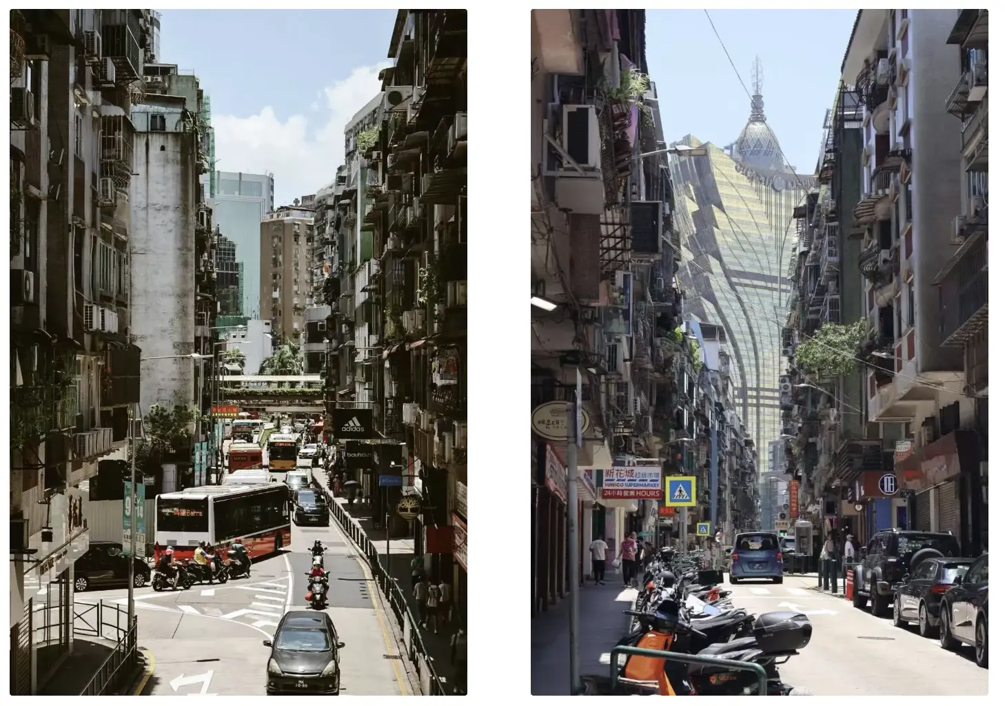 作为一个喜欢在街上溜达看街景的人,第一次去澳门体验还是很好的。澳门的各处景观差异足够大,既有富丽堂皇纸醉金迷,也有人间烟火气。除了赌场和几个歪果仁等最具特色的景点,街道景观和香港比较接近。不过个人觉得一点不同是:澳门有更加轻盈的色彩。香港给我的感觉还是有些老派的英式风格,似乎所有大色块的低调暗淡都是为了衬托那几抹亮眼的红,例如照片背景中一闪而过的计程车,再如明艳女郎爱穿的红裙。而澳门的街道上,除了娱乐场花里胡哨的那种彩色之外,还有很多薄荷绿色、浅黄色、天蓝色、淡粉色,即使是老旧的街区也因为色彩的存在而显得年轻生动了起来。