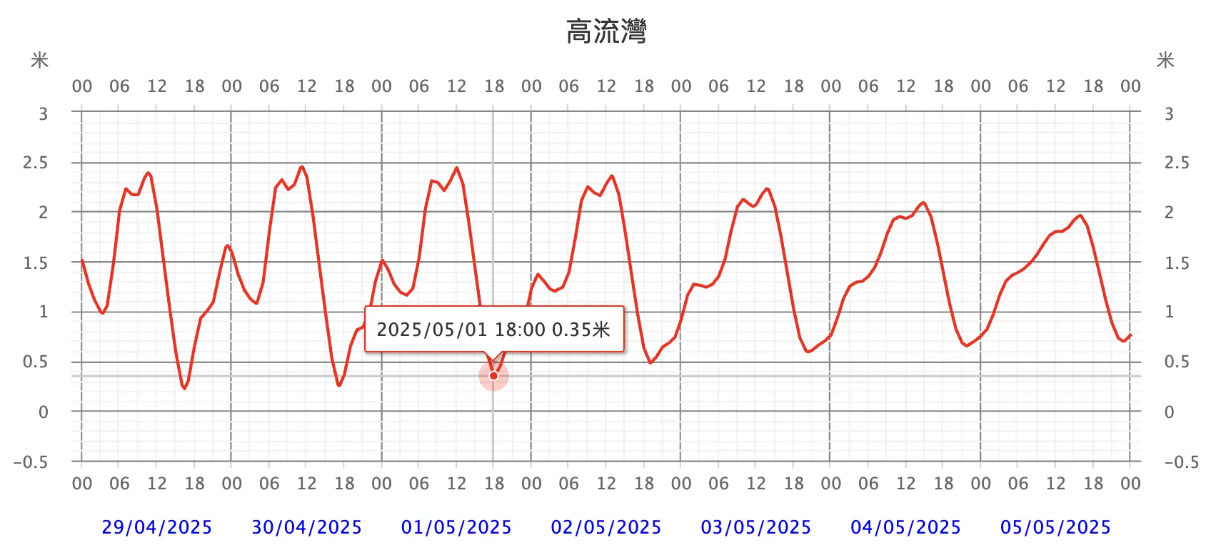 赶海最重要的是要提前查好当地的潮汐表,重点关注水位高度和涨潮、落潮时间。赶海人一般会在潮水最低点前一个小时开始赶海,确保赶海过程中不会因为涨潮造成被困孤岛的局面。如下图我查询的潮汐表,就可以在5月1日的下午五点开始赶海。