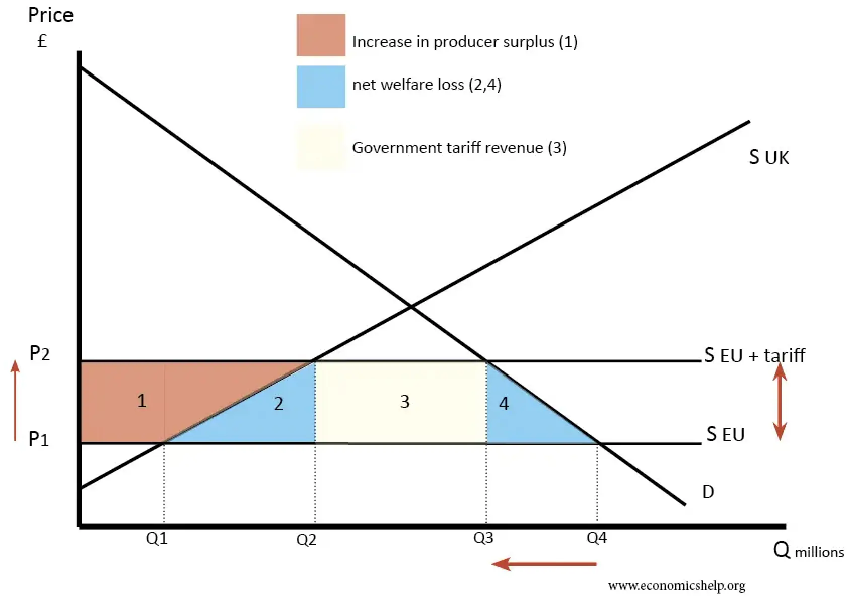 经典经济学的理论一直是关税会带来无谓损失(deadweight loss)。基于一定的市场价格,消费者有消费者剩余(consumer surplus),生产者有生产者剩余(producer surplus)。但政府施加关税后提高市场价格,提高本国生产者剩余、降低消费者剩余、获得关税收入之外,会产生一部分的损失,被称为无谓损失。